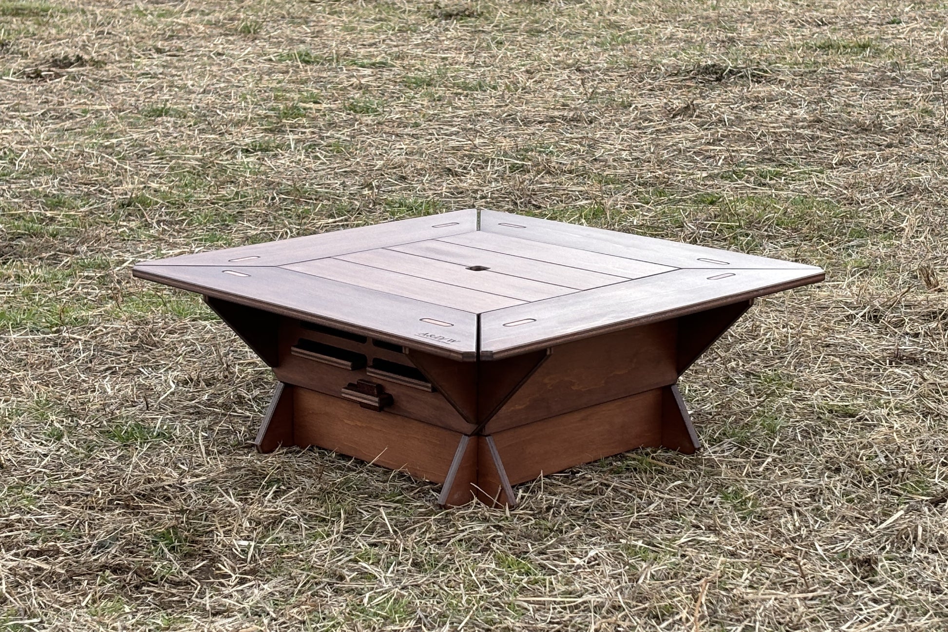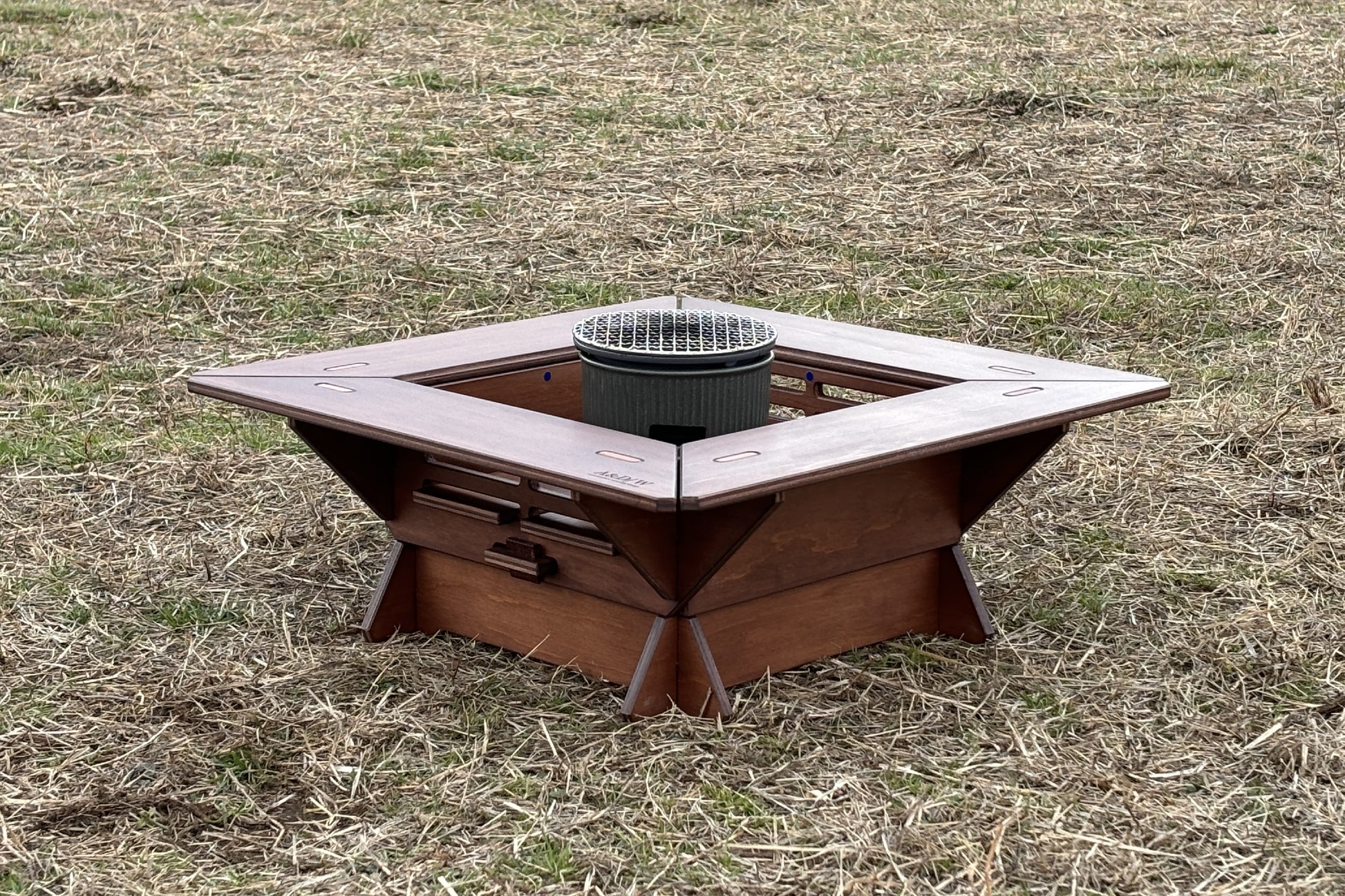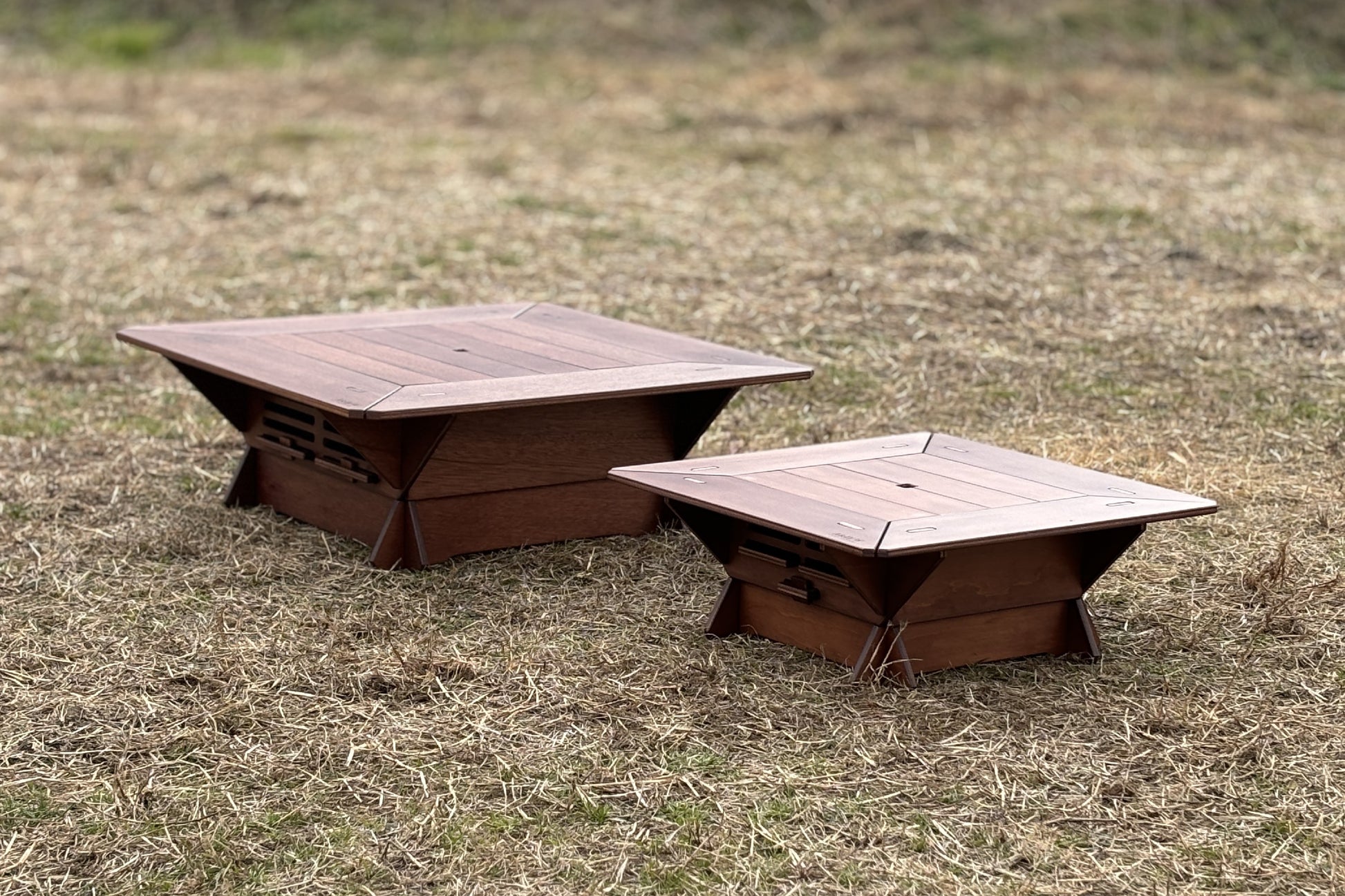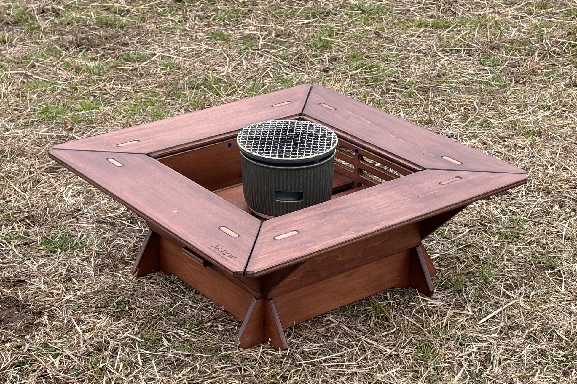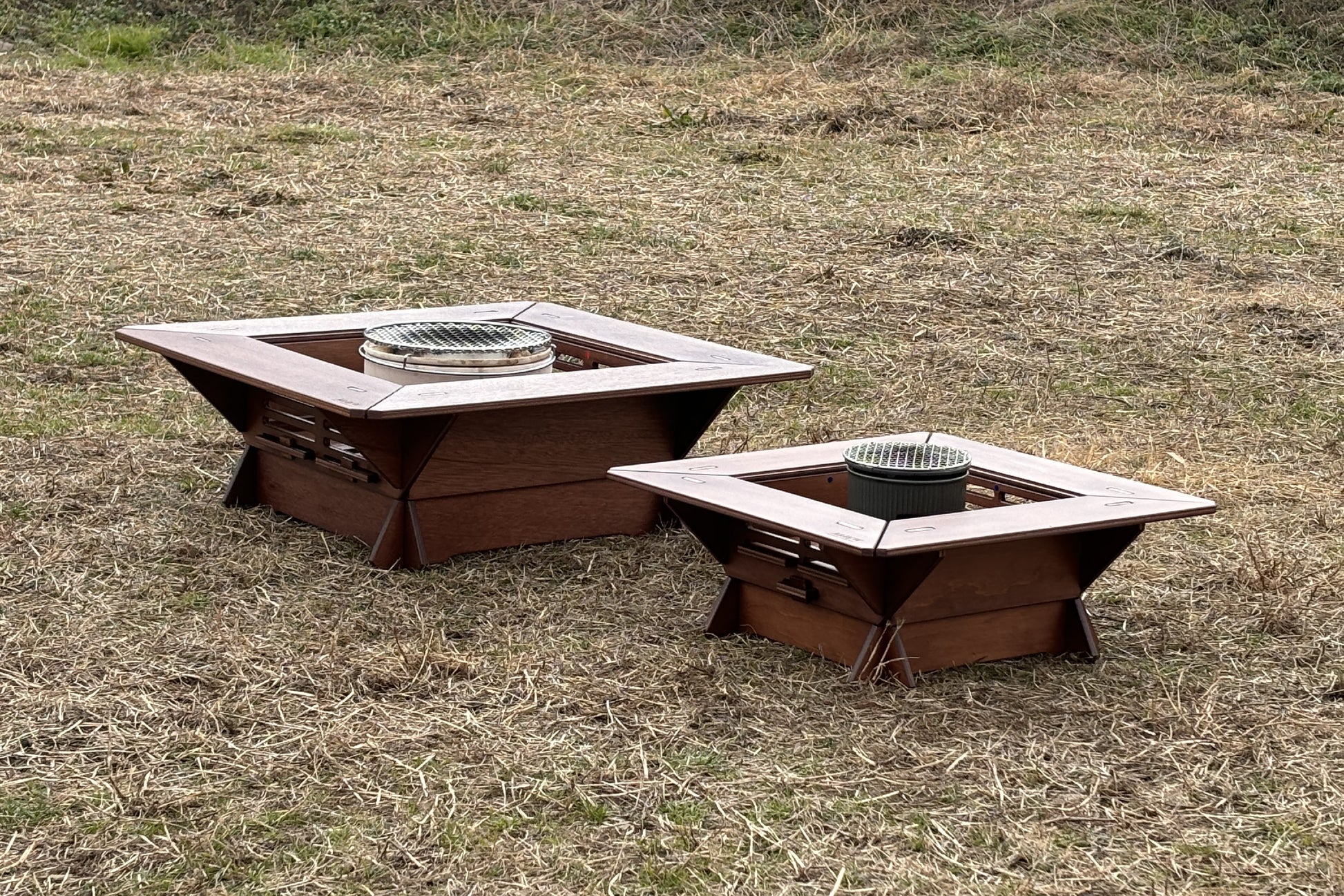 創業1945年、岩手県指定伝統⼯芸品の南部箪笥を⼿がける、株式会社マルイ造形家具⼯業により開発したアウトドアにも使用できる七輪囲炉裏。